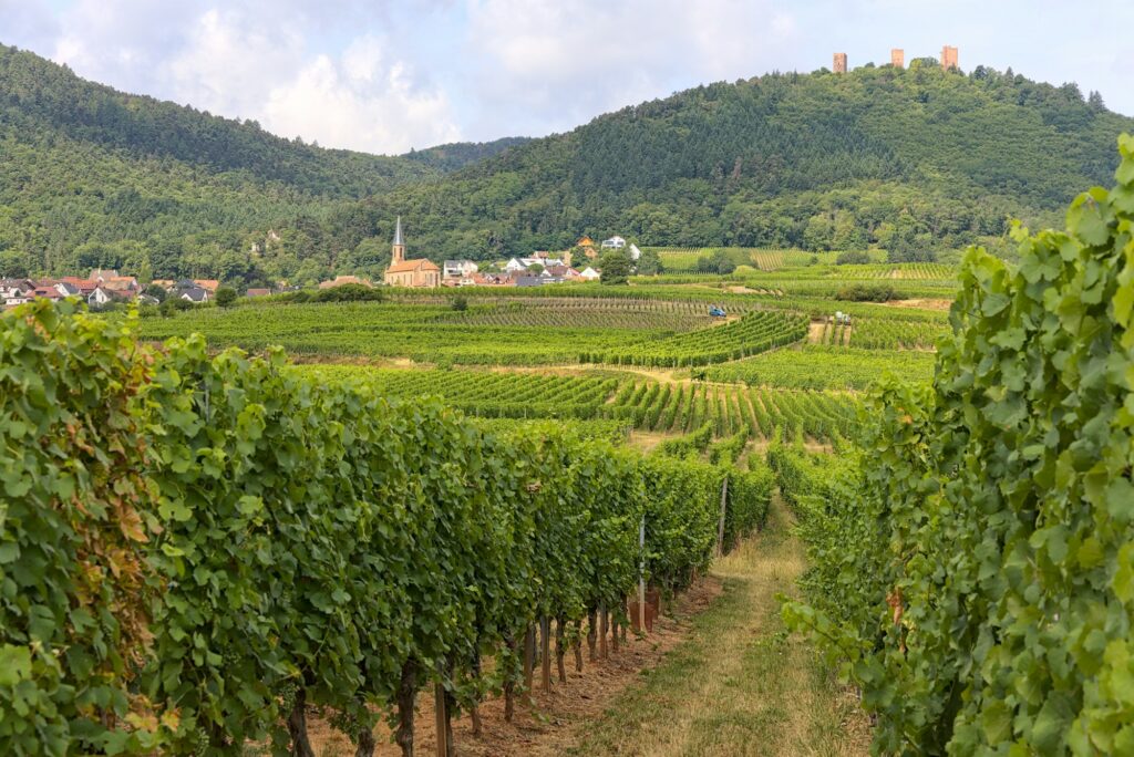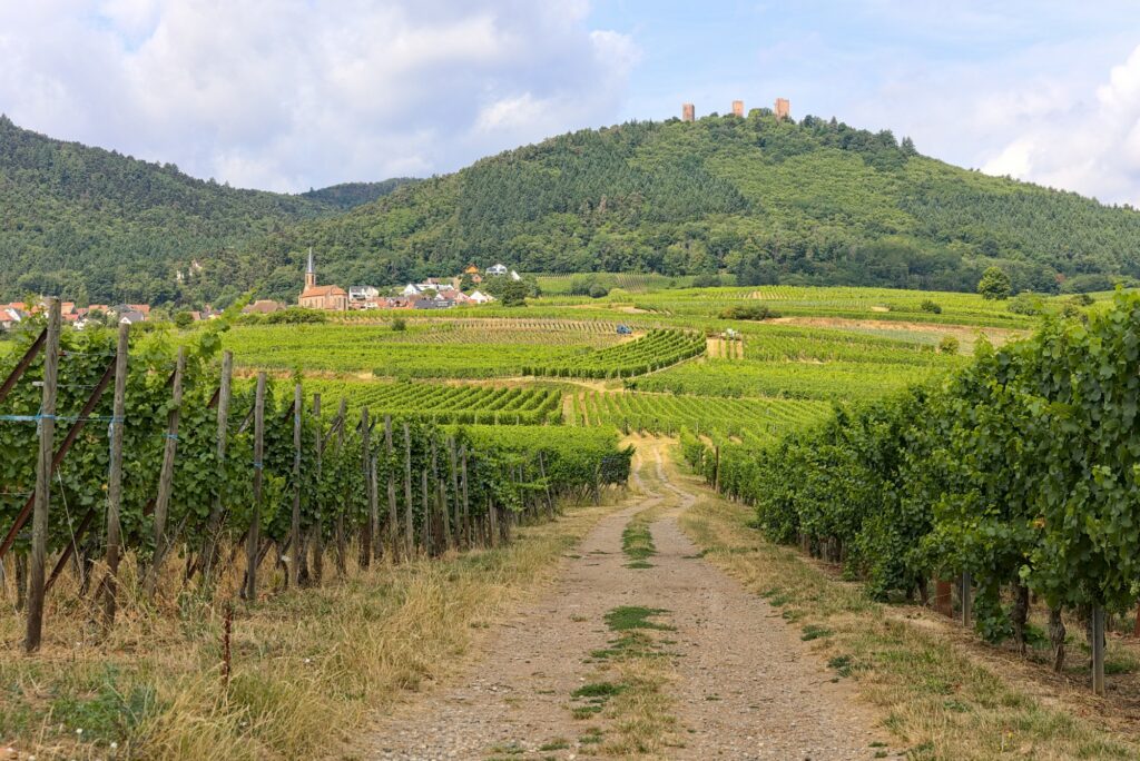 Notre gîte était situé à Bennwihr. Nous avions décidé d’aller jusqu’au château du Hohlandbourg et de marcher un peu pour aller voir les autres. Nous sommes donc passés par Eguisheim, sans nous y arrêter cette fois-là. Et sur la route d’Eguisheim vers Husseren-les-Châteaux, il y a un point de vue sympa sur Husseren, les châteaux et bien sûr les montagnes derrière :