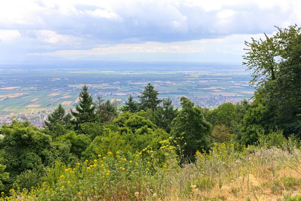 Nous nous sommes garés sur l’un des parkings en bas du château du Hohlandsbourg. Nous sommes montés au château. Devant celui-ci il y a une belle vue sur la plaine d’Alsace :